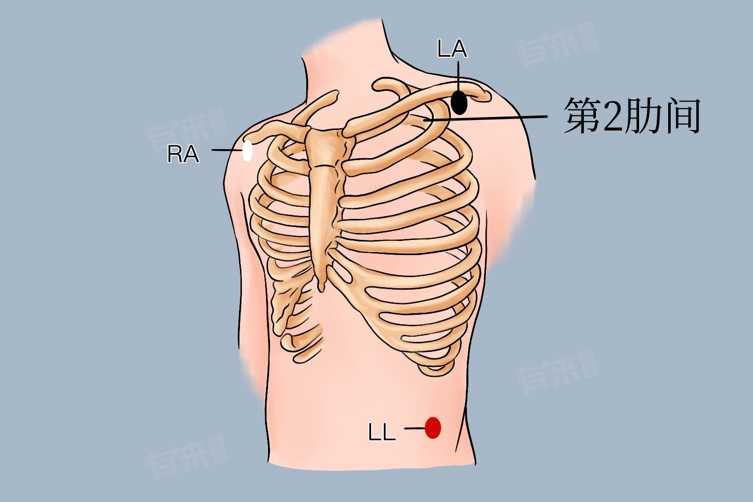 2、左上电极:位于胸骨左缘,锁骨中线第2肋间靠近左肩的位置,与右上电极相对应,左上电极能够捕捉到心脏左上部的电信号,有助于全面评估心脏的电活动情况。