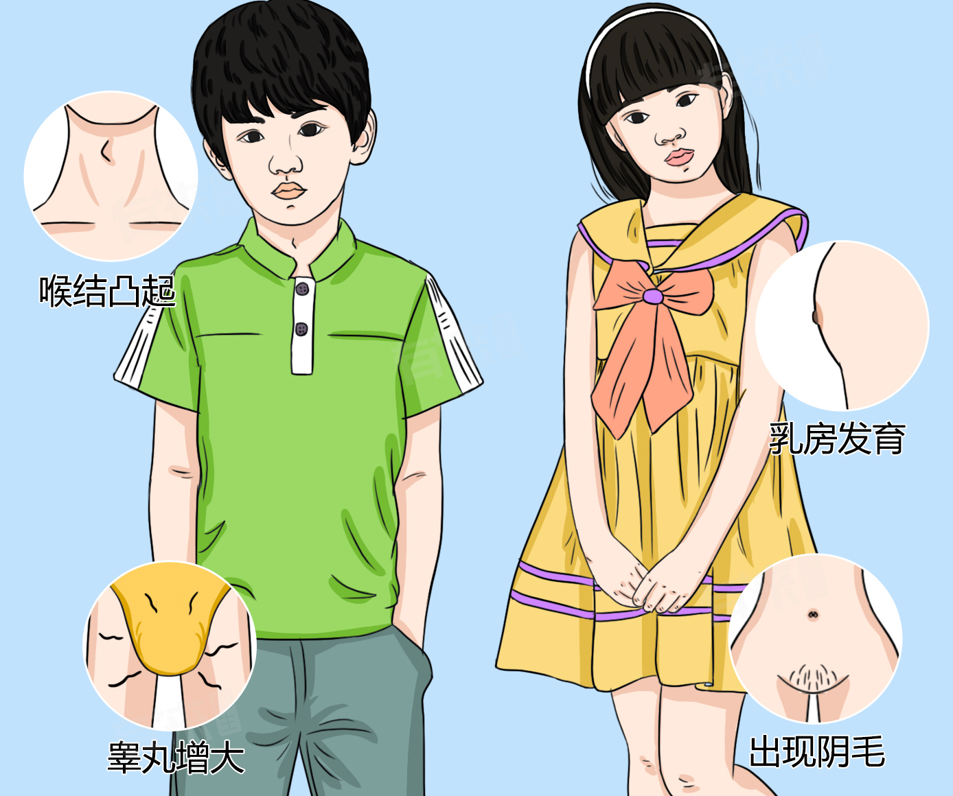 男孩:睾丸增大,阴茎增长,喉结突出,声音变低沉,胡须和体毛也开始生长。身高和体重迅速增长,骨骼系统也进入快速发育阶段。