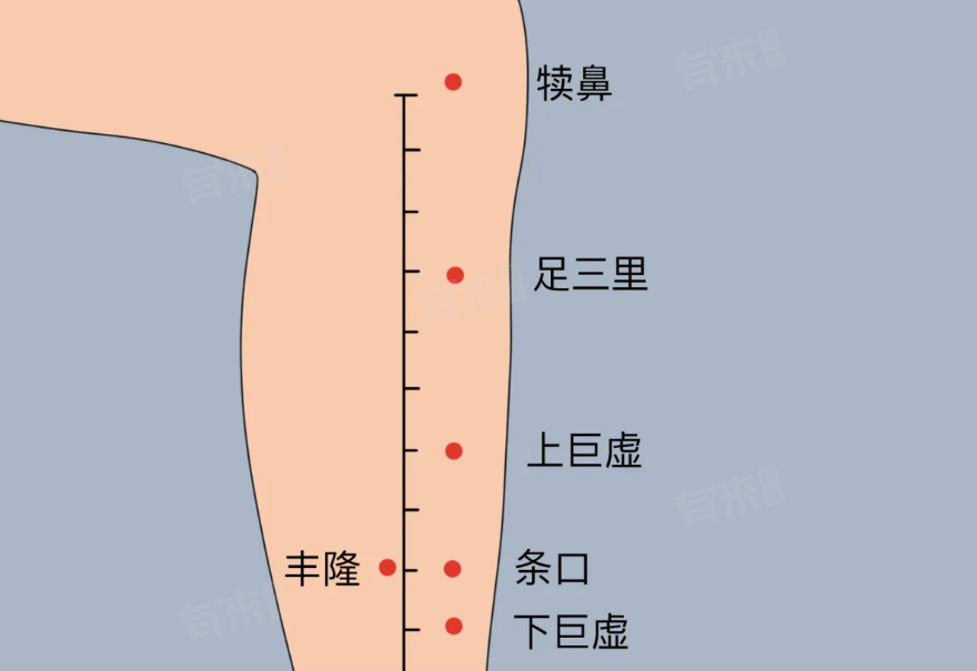 4、丰隆穴:位于外膝眼和外踝尖连线的中点,丰隆穴对脾胃两大脏腑都有很好的调理作用,是除湿祛痰的主要穴位。