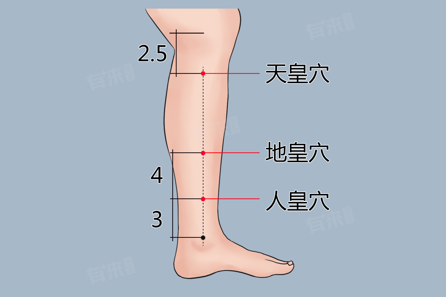 - 人皇穴:又称为三阴交穴,位于小腿内侧,足内踝尖上3寸,胫骨内侧缘后方位置。穴位是足太阴脾经、足少阴肾经、足厥阴肝经三经交汇之处。