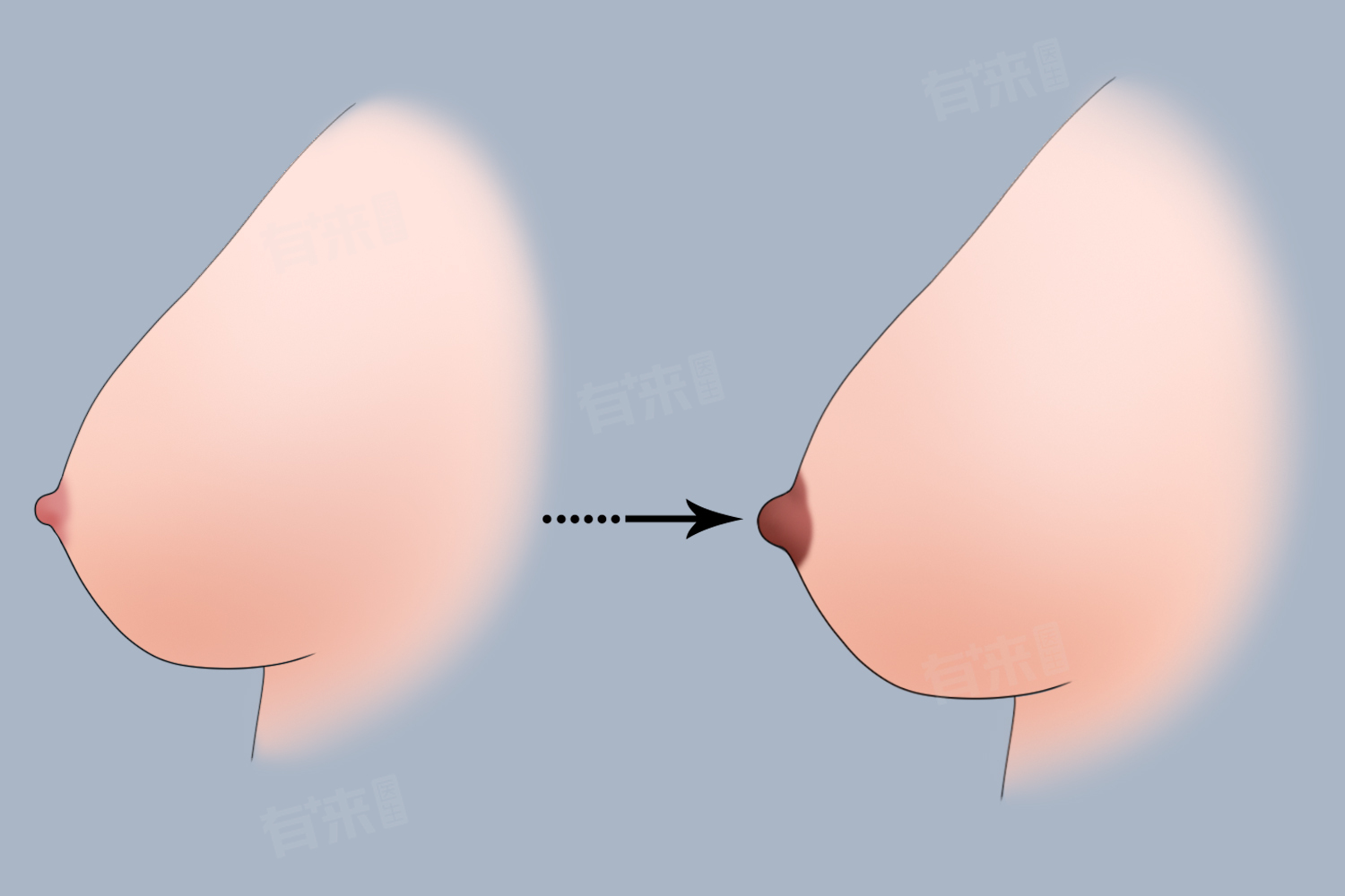 - 乳晕变化:乳晕区域色素开始加深,变得更为明显,乳晕上的皮脂腺会增生导致局部色素沉着,使乳晕颜色可能变成黑色或棕色。