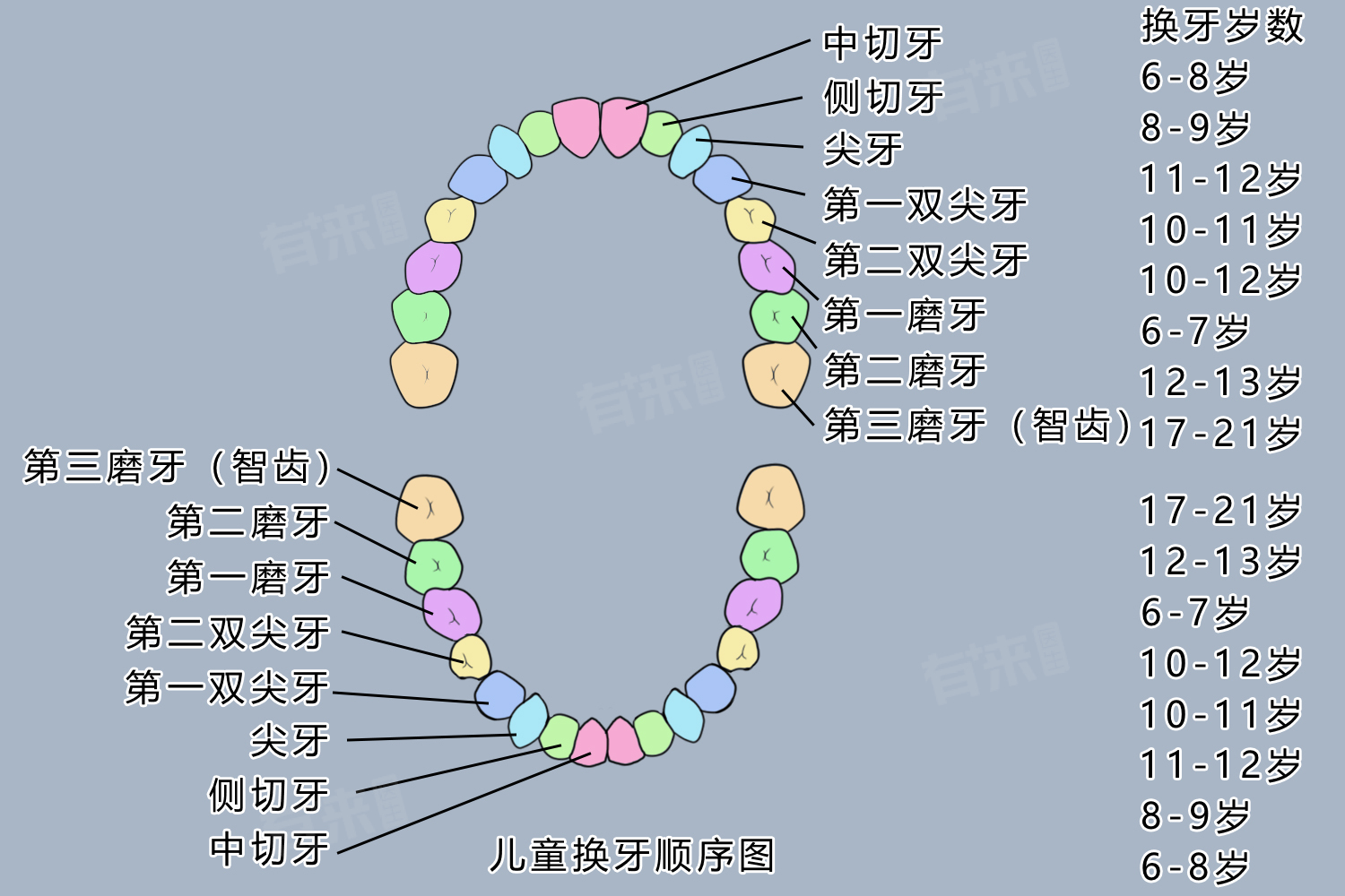 - 恒牙排列:恒牙在6岁左右开始替换乳牙,直至12-13岁替换完成。恒牙的排列顺序与乳牙相似,但种类更多,包括中切牙、侧切牙、尖牙、第一双尖牙、第二双尖牙、第一磨牙、第二磨牙以及第三磨牙。这