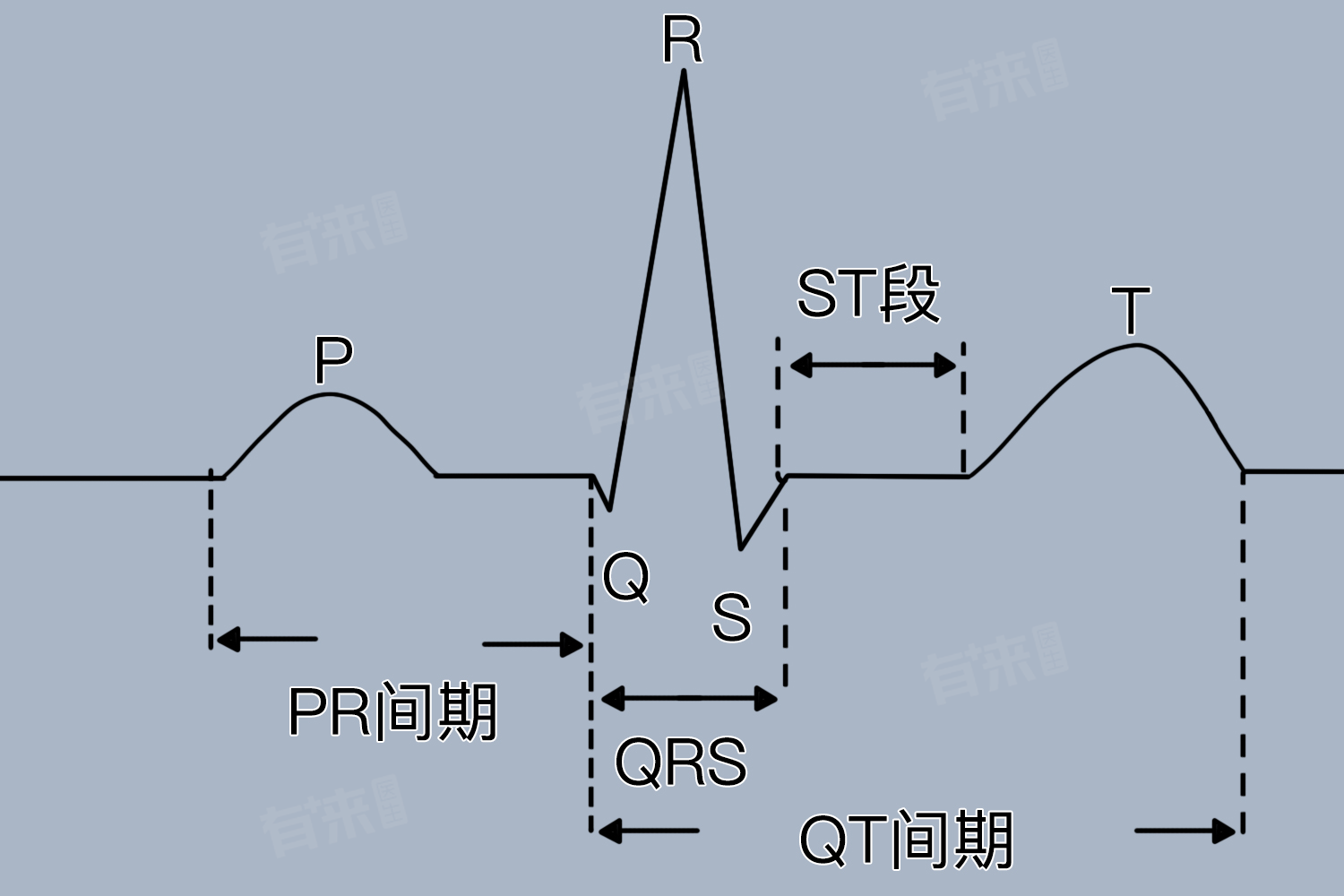 - QRS波群:反映心室的除极过程,是心电图上最明显的波形。包含三个波,向下的Q波、向上的R波和向下的S波。正常QRS波群时间在0.06-0.10秒之间,超过0.12秒可能表示心室传导异常或心室肥大。