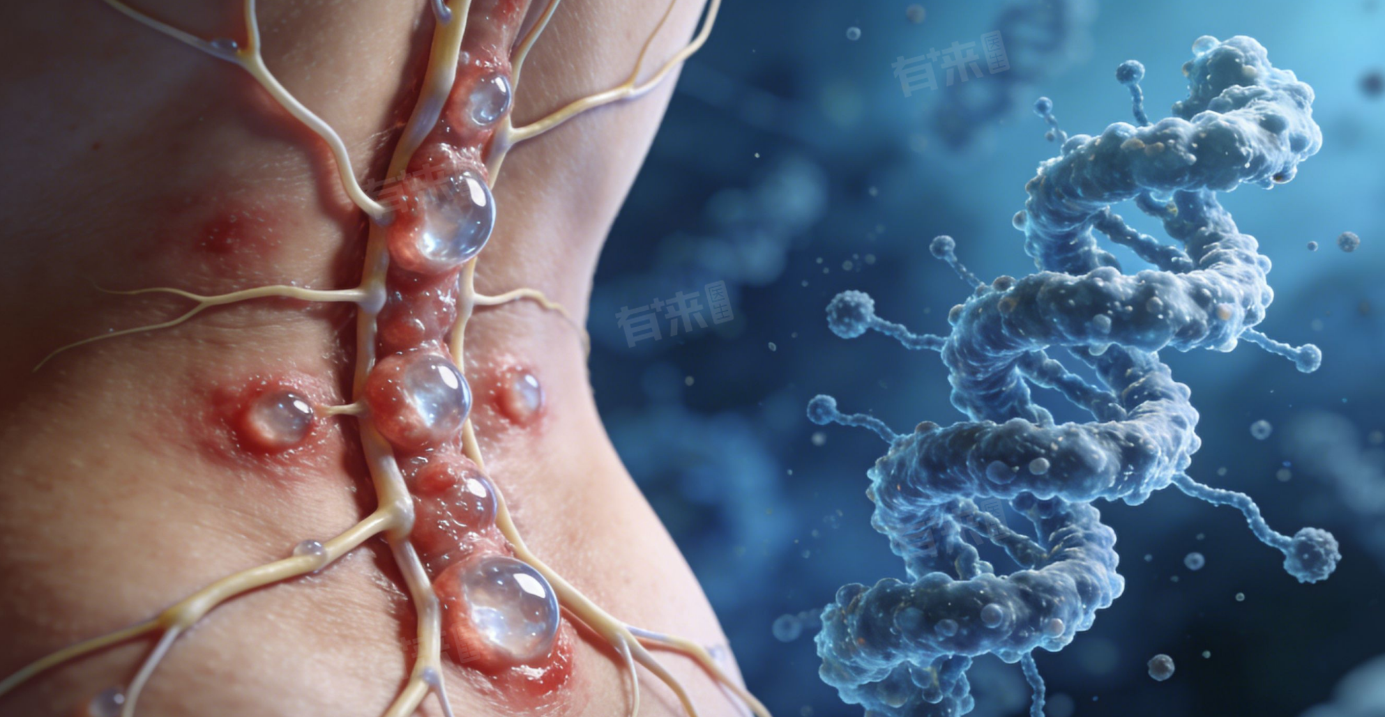 2、免疫力下降:当人体免疫力降低时,潜伏的病毒会被激活,大量复制并沿着神经走向扩散,侵犯皮肤和神经,引发蛇盘疮。免疫力下降是蛇盘疮发病的主要诱因。