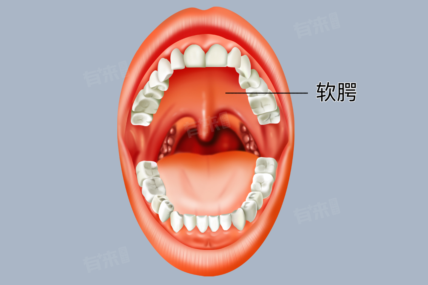 软腭位于口腔与咽部交界处,上接鼻腔后部,下连口咽部,静止时自然下垂构成口腔顶部后半部分,吞咽时上抬封闭鼻咽部以保障吞咽顺利,与舌根协同作用于吞咽和发音,虽小却对呼吸、吞咽、发音影响大。