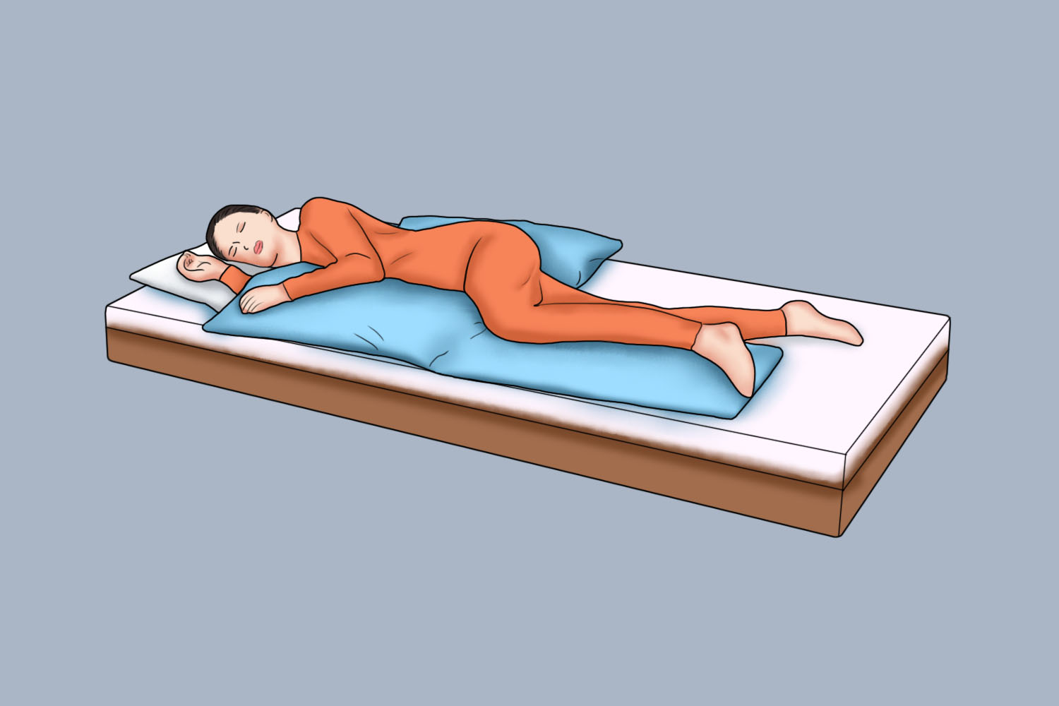 - 身体侧卧,双腿之间夹一个枕头,使髋关节和膝关节微屈,可以减轻腰部肌肉的张力,缓解椎间盘的压力,上方的手臂自然放在胸前,下方的手臂屈肘,将手掌垫于头部下方。