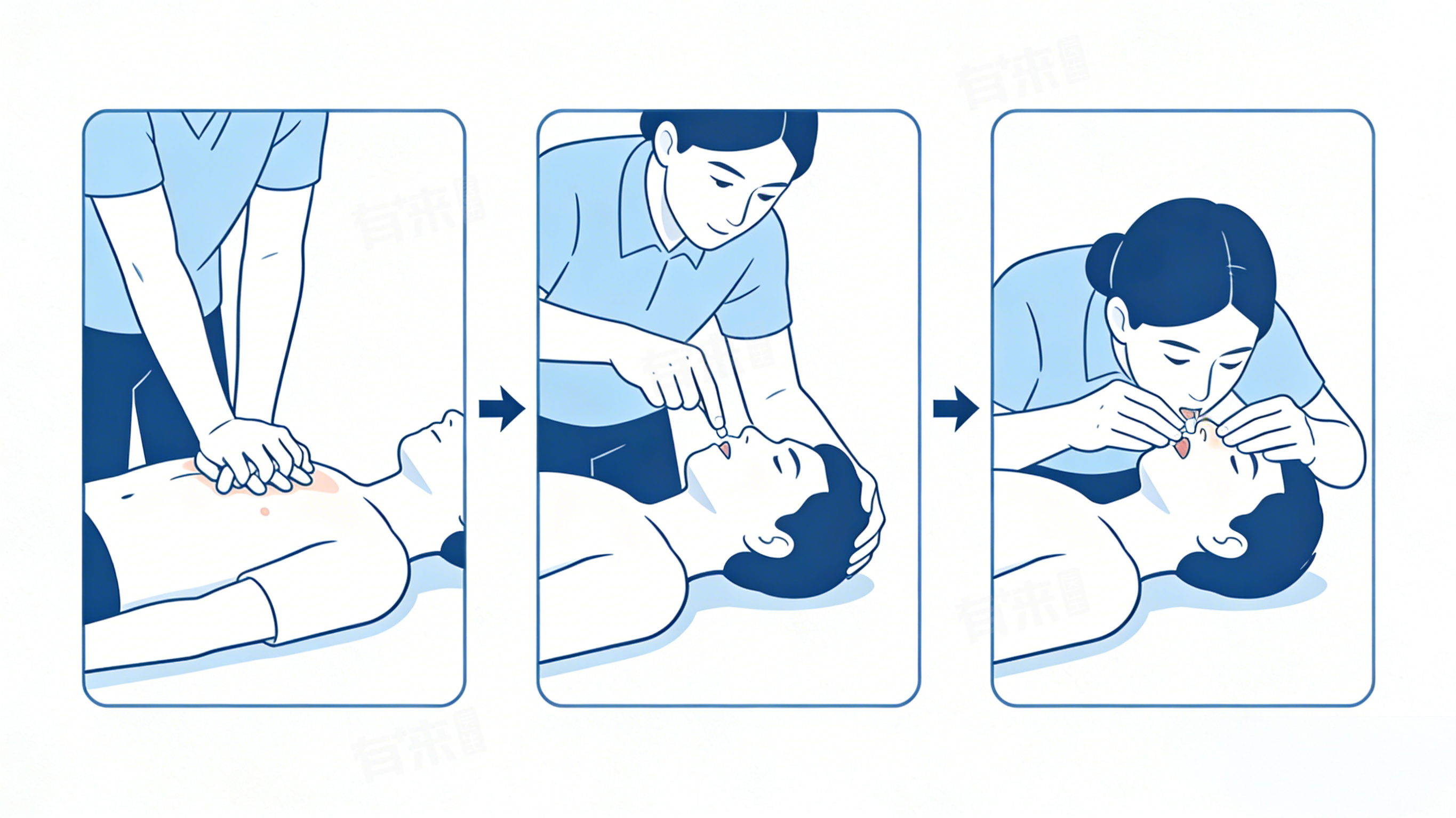 4、人工呼吸:捏住患者鼻翼,用口唇完全包裹患者口唇,缓慢吹气,每次吹气时间不少于1秒,观察患者胸部是否起伏,确保吹气有效;每吹气2次,配合胸外按压,保持呼吸与按压的协调,避免过度通气。