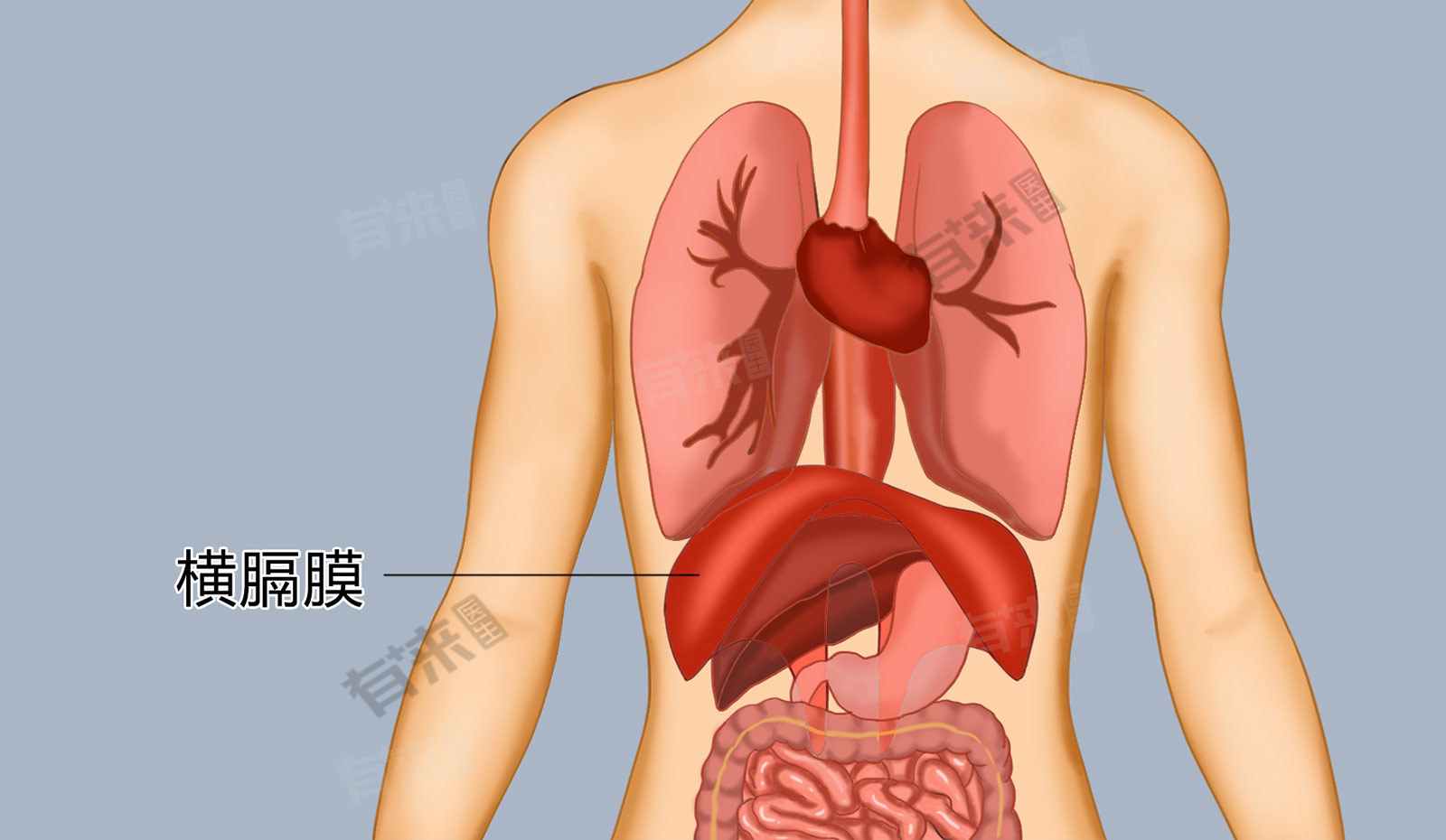 横膈膜是人体内一个重要的膜状结构,它位于胸腔和腹腔之间的分界处。横膈膜以胸骨的剑突后、第6对肋骨、第2-3腰椎为起点,以中心腱为止点,与胸膜和腹膜紧密相连。它的上部紧邻肺、心脏、食管等胸腔脏器,而下部则与肝、脾脏、胃、肠道及肾等腹腔脏器相邻。
