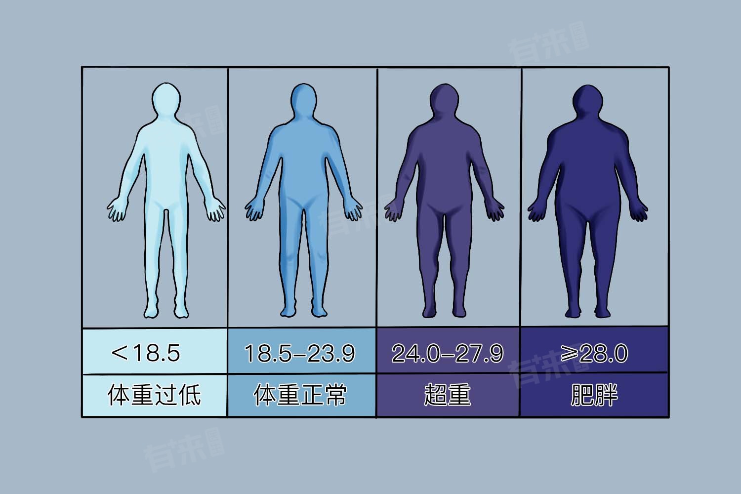 - 当BMI值≥28kg/m²时,则被认为是肥胖状态,可能增加多种健康问题的风险,如心血管疾病、糖尿病等,需要采取积极的减重措施。