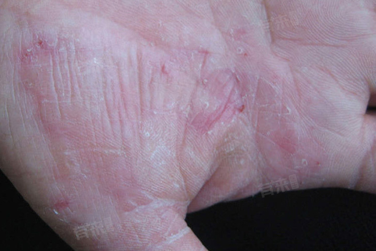 4、慢性湿疹型手癣:手掌皮肤并不会出现明显的水疱,但会逐渐变得粗糙且增厚,皮纹加深。伴有小片鳞屑,边界不清晰,瘙痒症状明显。冬季手掌容易发生皲裂并引起疼痛。