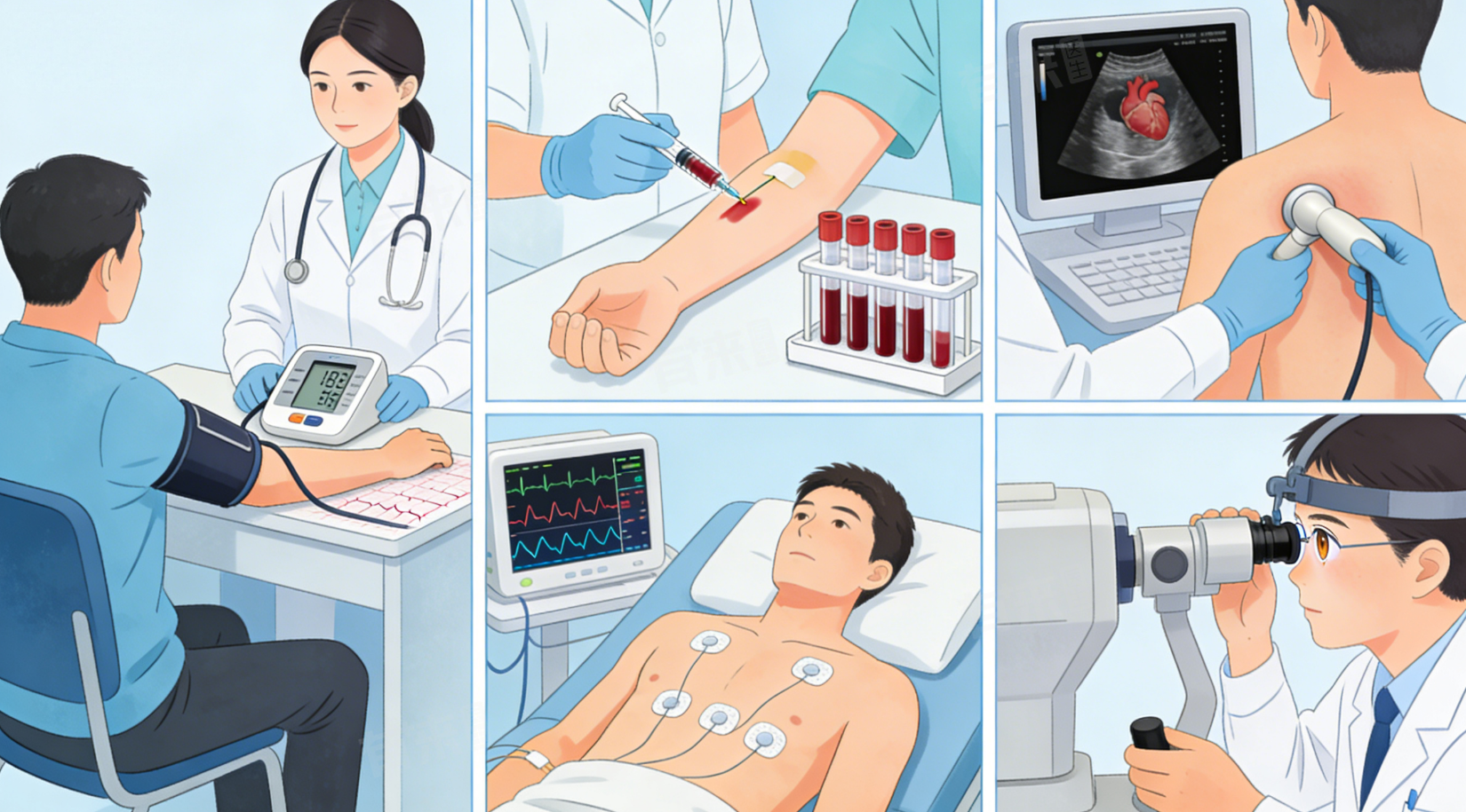 5、心脏超声检查:通过超声观察心脏结构和功能,评估高血压对心脏的损伤,排查高血压性心脏病,同时排除心脏疾病引发的继发性高血压,该检查可明确靶器官受损程度,指导治疗方案调整。