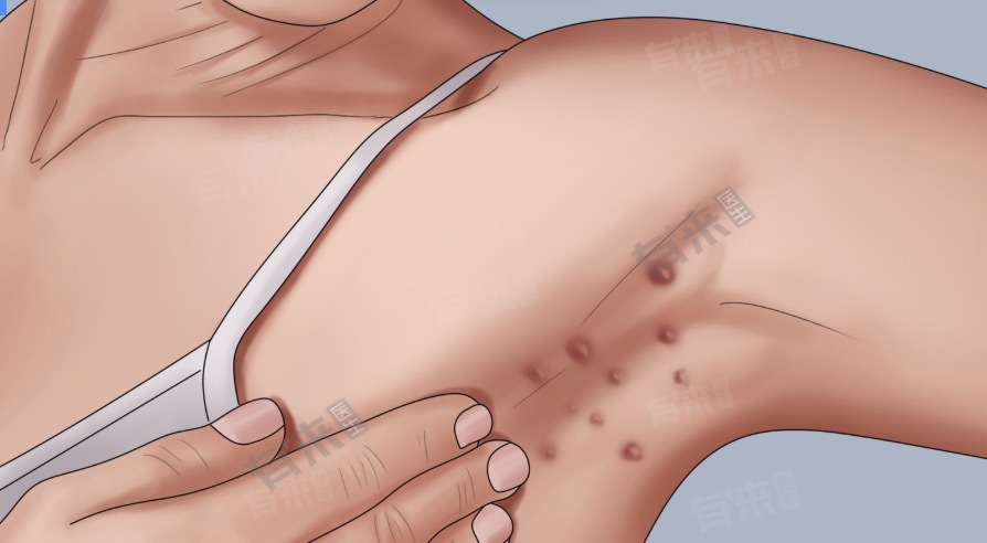 腋窝部位的毛囊炎可能由细菌感染引起,表现为红色丘疹或脓疱,有时可误认为是小肉粒。治疗需保持局部清洁,可遵医嘱外用抗生素软膏,严重时可口服抗生素。