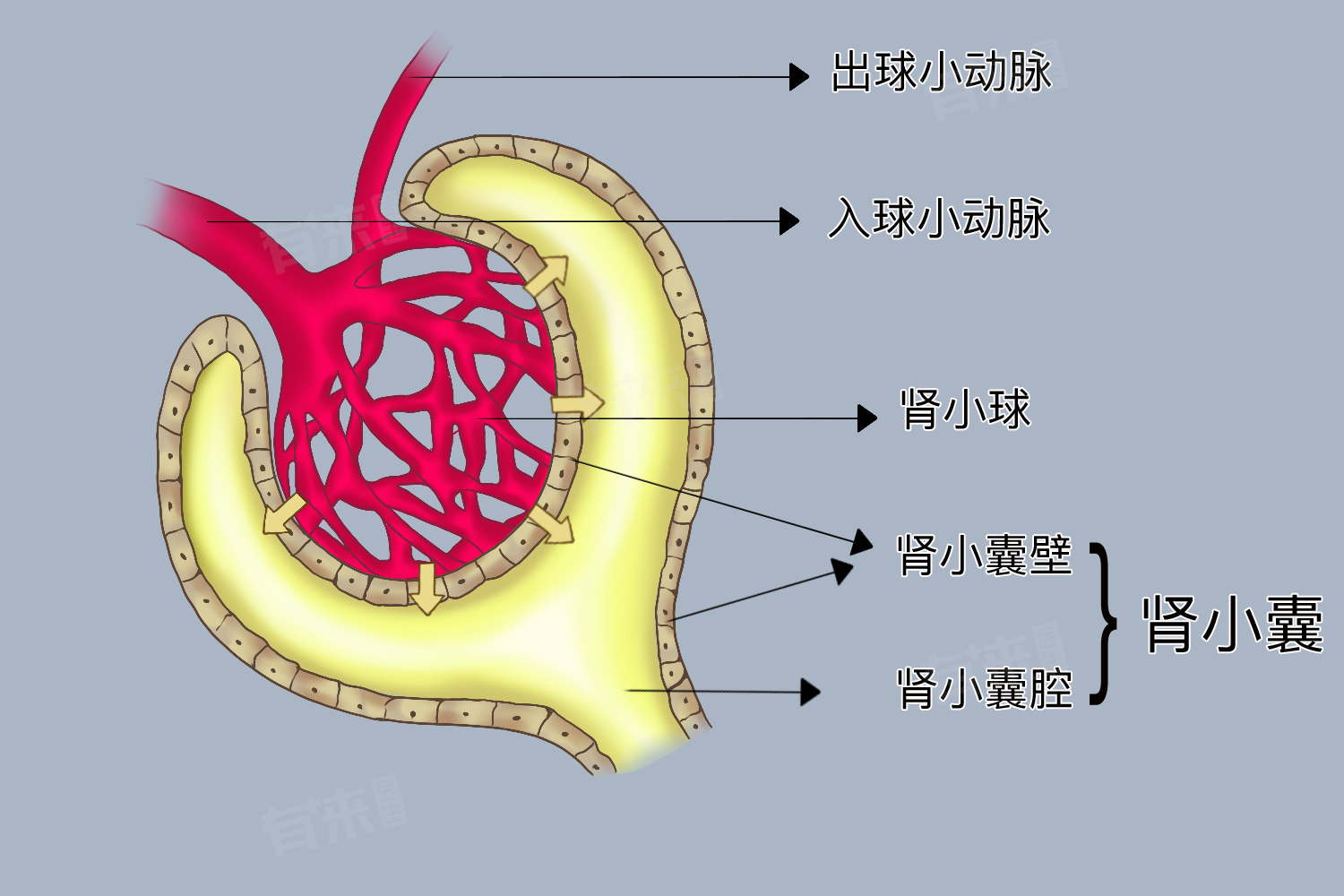 - 肾小体由肾小球和肾小囊组成,肾小球是一团毛细血管网,它就像一个精细的过滤器。血液流经肾小球时,除了血细胞和大分子蛋白质外,其他物质如水分、葡萄糖、无机盐、尿素等都可以通过肾小球滤过到肾小囊中。肾小囊是肾小管起始部膨大凹陷而成的双层囊,它承接了肾小球滤过的液体。