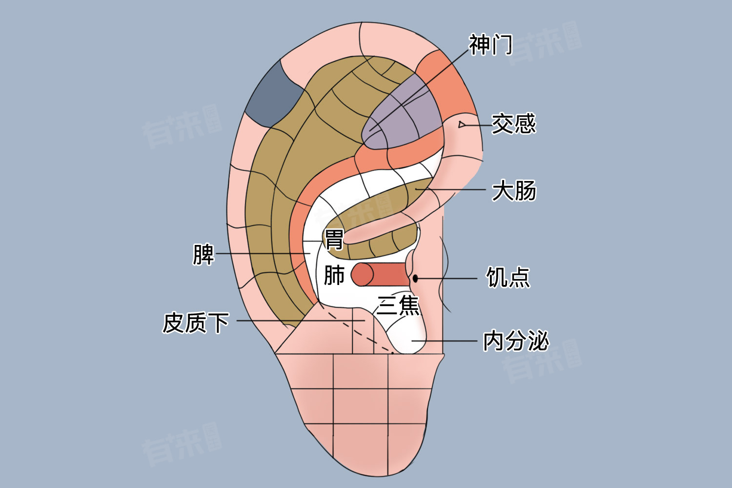 - 中医认为,耳部与全身各脏腑器官有着密切的联系。通过刺激耳部穴位,可以调节相应脏腑的功能,达到治疗疾病的目的。