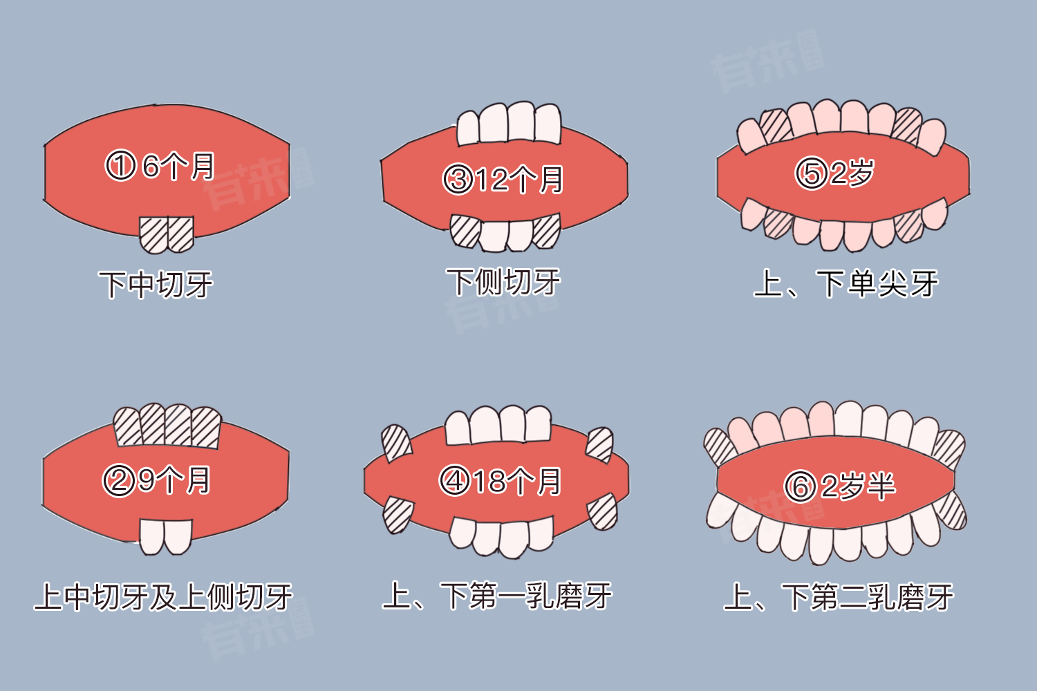 乳牙的萌出顺序一般为乳中切牙、乳侧切牙、第一乳磨牙、乳尖牙、第二乳磨牙。乳切牙每侧上下各2颗,共8颗,主要负责切割食物,是儿童早期咀嚼功能的重要组成部分。乳尖牙每侧上下各1颗,共4颗,牙形态尖锐,有利于撕咬食物,同时也在维持牙弓形态和咀嚼肌功能方面发挥重要作用,而乳磨牙每侧上下各2颗,共8颗,主要负责研磨食物,将食物细化以便于吞咽和消化。