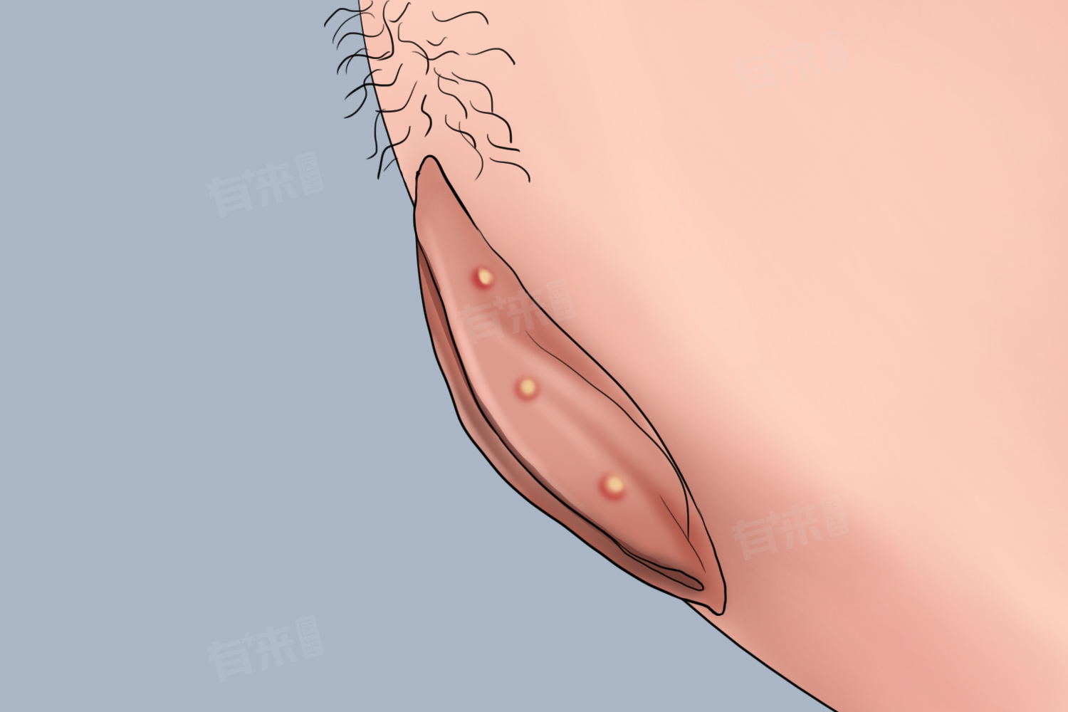5、皮脂腺囊肿:毛囊皮脂腺口堵塞,皮脂聚积后形成囊肿,表现为外阴侧硬疙瘩,若症状未缓解,需手术切除。