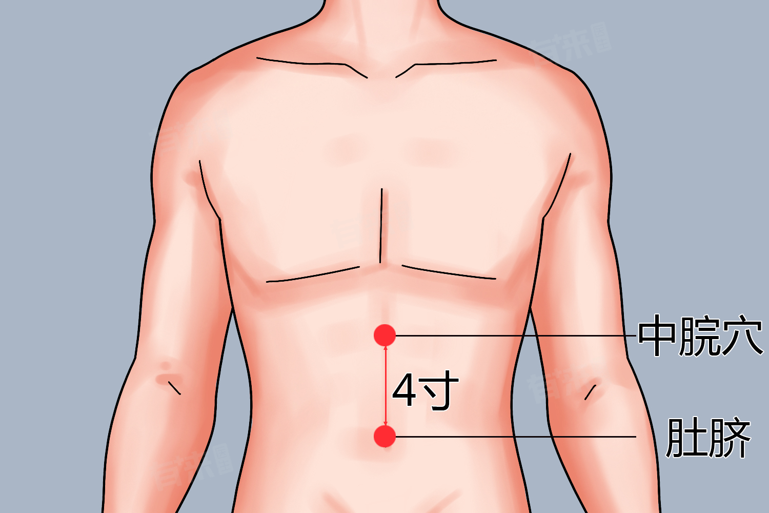 中脘穴的确切位置并非简单地以肚脐上几指来界定,而是需要根据中医的手指同身寸法来测量。一般中脘穴位于上腹部前正中线上,脐上4寸处,4寸并非日常使用的长度单位,而是中医特有的度量方式。