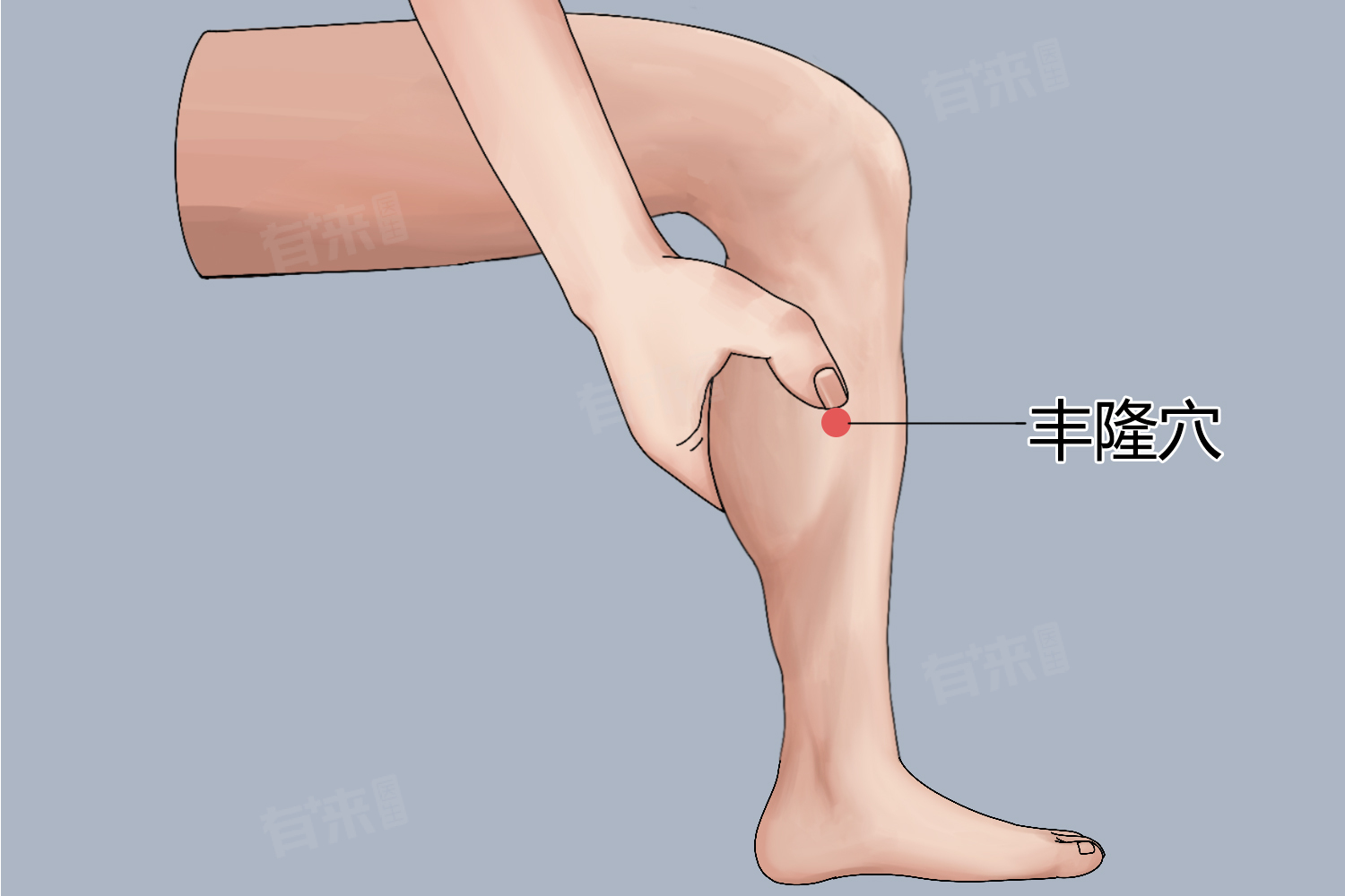 4、缓解疼痛:丰隆穴能够促进局部的气血循环,消除瘀血和炎症,从而缓解疼痛。特别是对于关节疼痛、腰腿疼痛等症状有较好的缓解作用。