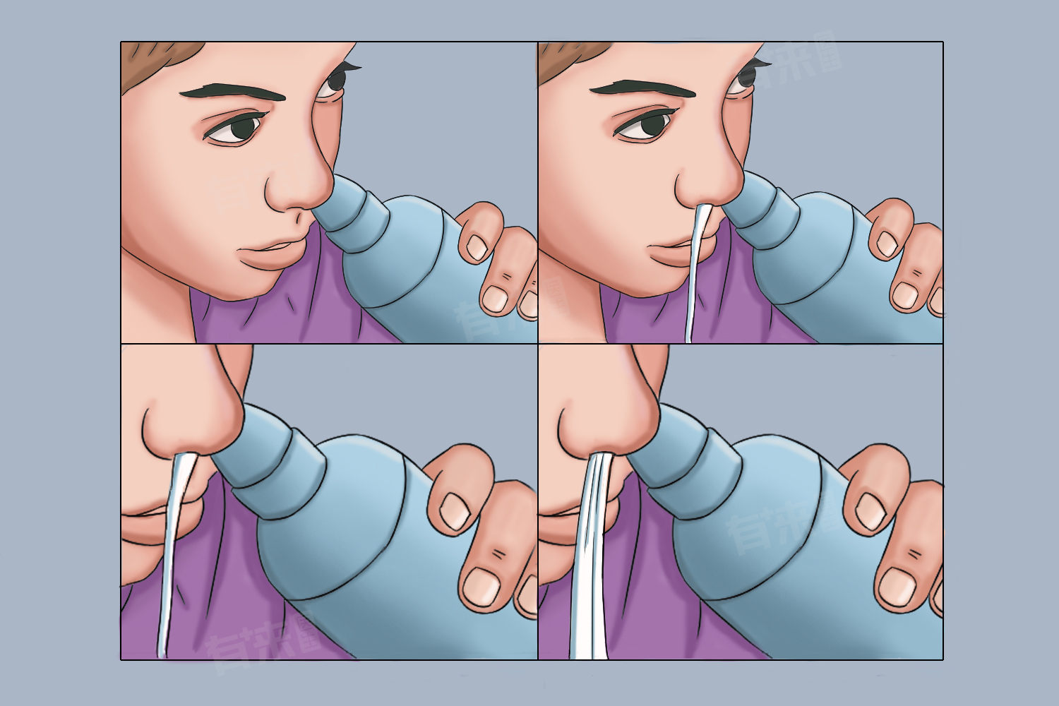 3、插入洗鼻器:将洗鼻器的喷头轻轻放入一侧鼻孔边缘,注意不要过深插入,防止损伤鼻腔黏膜。喷头方向应朝向鼻腔外侧壁,而非直接对着鼻中隔。