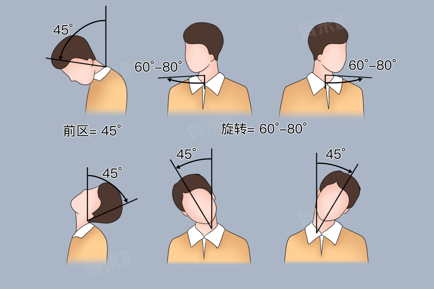 颈椎活动度的正常范围大致为前屈、后伸45度,左右侧屈各45度,左右旋转各60-80度。由于每个人的生理结构存在差异,这一范围在不同个体之间可能存在波动。