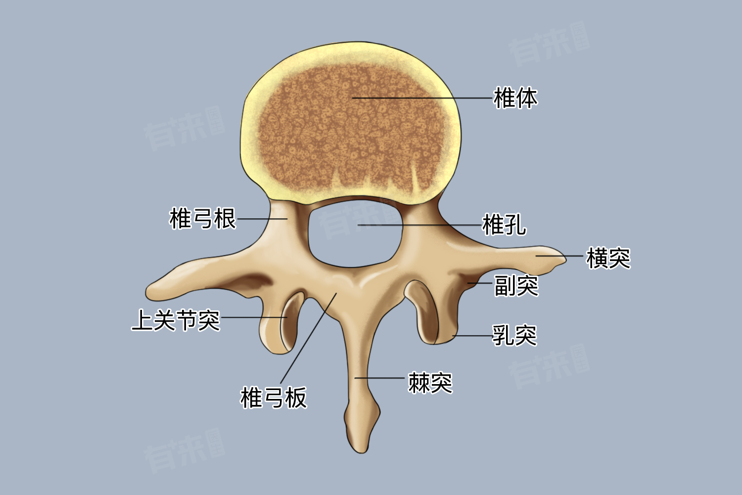 - 椎骨一般由两大部分组成,包括前方的椎体和后方的椎弓。椎体是椎骨的主要承重部分,呈短圆柱形,它的主要任务是支撑体重并将负荷传递给下方的椎骨。椎体的大小从颈椎到腰椎逐渐增大,以适应各段脊柱承受的压力变化。例如,颈椎的椎体相对较小且轻巧,适合头部的灵活运动;而腰椎的椎体则较大且厚实,能够承担更大的重量和支持躯干的稳定性。