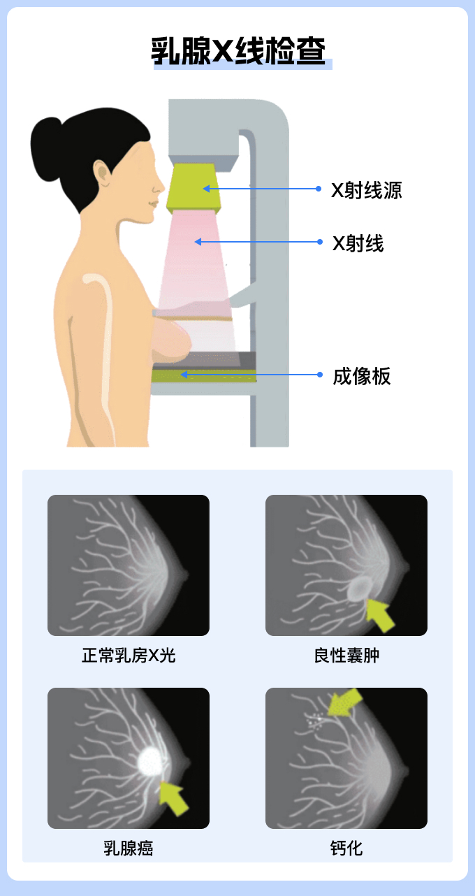 乳腺钼靶检查是一种常用的检查方式,建议40岁以上女性每两年做一次检查,50岁以上的女性每年做一次检查。乳腺钼靶检查是一种简单、可靠、无创的检查手段,具有分辨率高、重复性好、不受年龄和体型限制等优点。