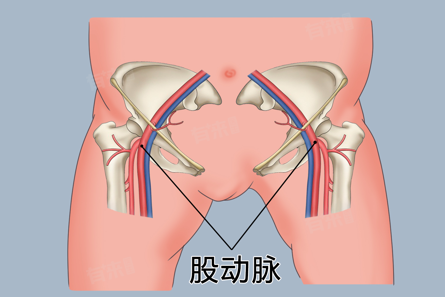 - 股动脉作为髂外动脉的延续,在腹股沟韧带中点后方接续,随后沿股三角下行,穿收肌管,出收肌腱裂孔至腘窝,移行为腘动脉。在人体体表,股动脉投影于腹股沟中点至收肌结节连线的上2/3段。腹股沟中点位置可通过触摸确定,该点是寻找股动脉的关键体表标志。