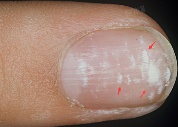 - 真菌感染:真菌感染指甲也可能导致指甲上出现白色点块。这种感染通常始于甲远端、侧缘或甲褶部,表现为甲颜色和形态异常。