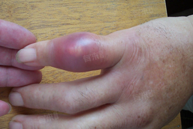 5、痛风性关节炎:由于遗传、饮食不当等因素,导致体内的尿酸生成过多且浓度升高,尿酸结晶沉积在小拇指关节引起炎症反应,造成关节肿大、疼痛、皮温升高等症状。