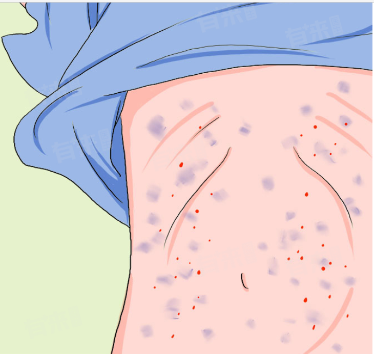 4、紫癜:紫癜是一种由于皮下出血引起的皮肤病变,表现为身上出现红色或紫色的斑点、斑块,紫癜可能由血小板减少、凝血功能障碍、血管壁异常等多种因素引起。紫癜引起的红点可能更加严重,且可能伴随其他症状,如关节疼痛、腹痛等,需要及时就医。