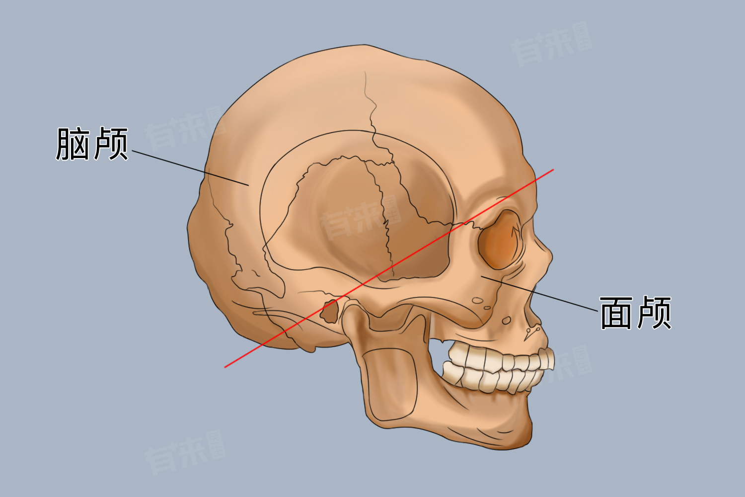 头骨结构分为脑颅和面颅两部分,脑颅的颅骨穹顶由额骨、顶骨、枕骨等构成,颅底分前、中、后颅窝。面颅中的眼眶、鼻腔、口腔各有其骨骼组成,结构分别在保护器官、空气调节、口腔动作等。