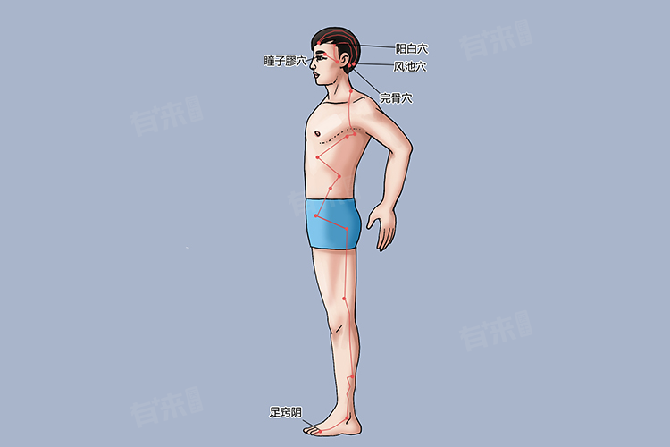 - 主干走向从缺盆下行腋下,沿胸侧过季肋,下行会合于髋关节部(环跳穴),从髋关节部向下沿大腿外侧中线下行,经膝关节外缘,行于腓骨前面,直下至腓骨下端。下出外踝之前,沿足背行至足第四趾外侧端(足窍阴穴)。
