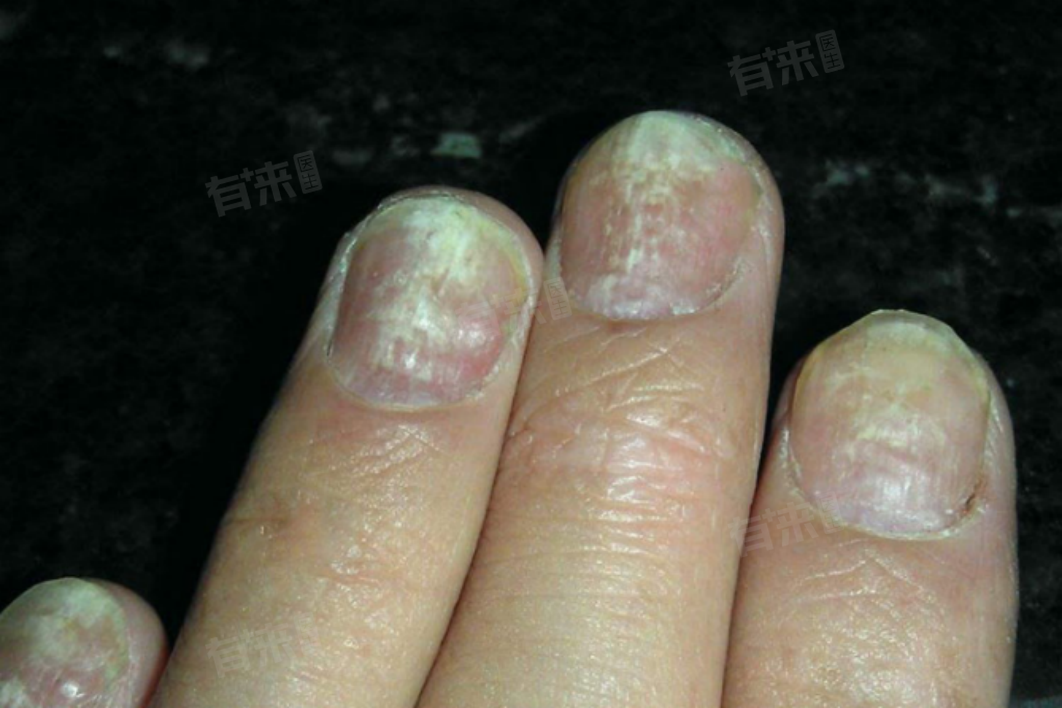 4、甲真菌病:由皮肤癣菌、酵母菌等真菌感染甲板及甲下组织所致。真菌侵入指甲后,在甲板内大量繁殖,破坏甲板结构,改变其颜色和质地,初期可表现为指甲表面出现白色斑点。随着病情发展,斑点逐渐扩大,指甲变得浑浊、增厚、易碎。甲真菌病具有传染性,可通过直接接触或共用拖鞋、毛巾等物品传播,且治疗周期较长。
