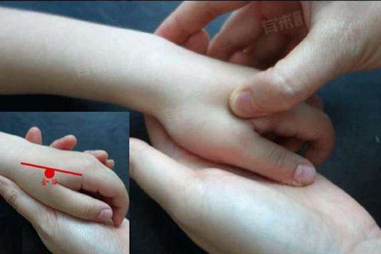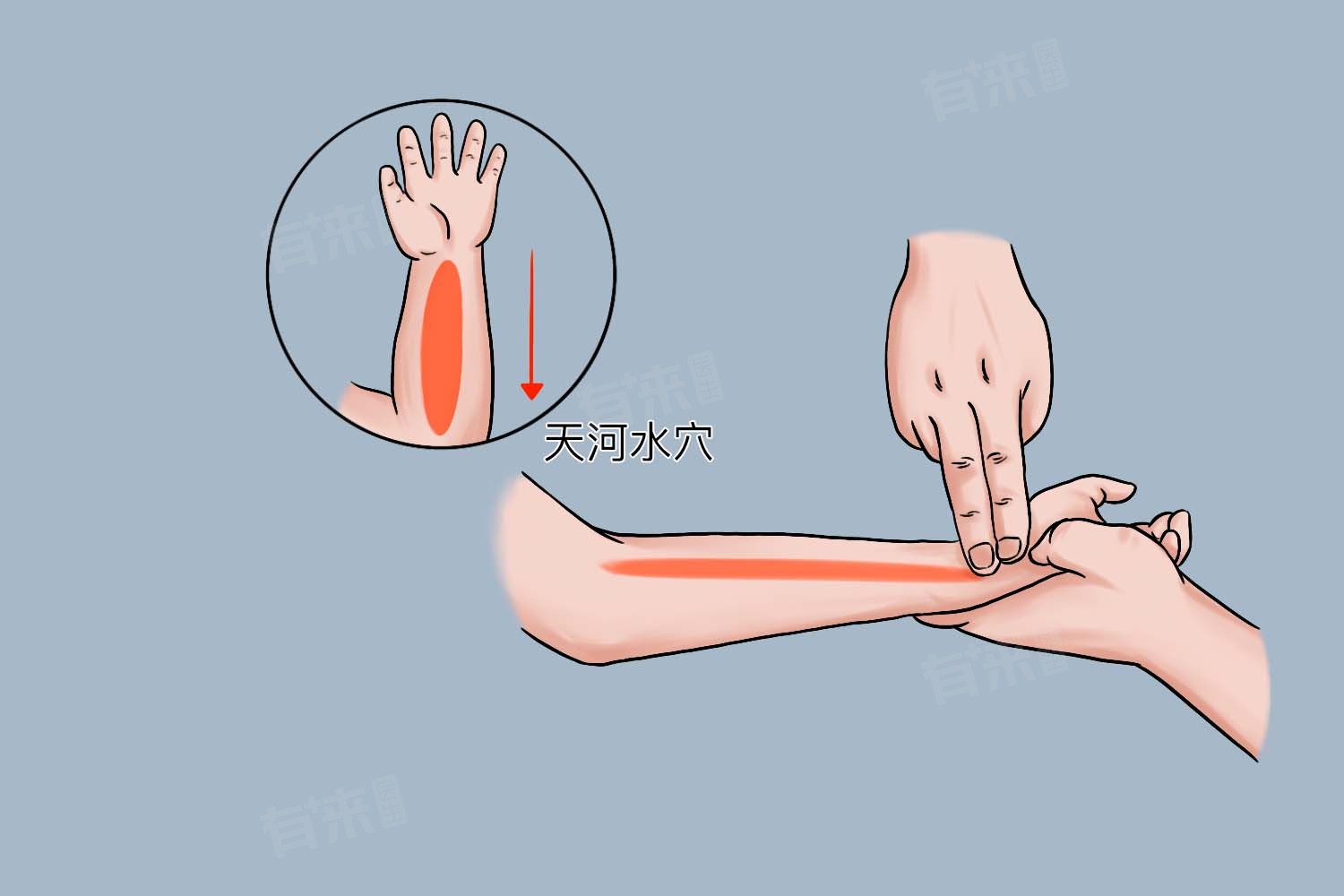- 用食指和中指指腹,从腕横纹均匀推至肘横纹,力度要大,速度要快,一般需要推拿200-300次,甚至更多。也可以蘸取少量凉白开水进行推拿。