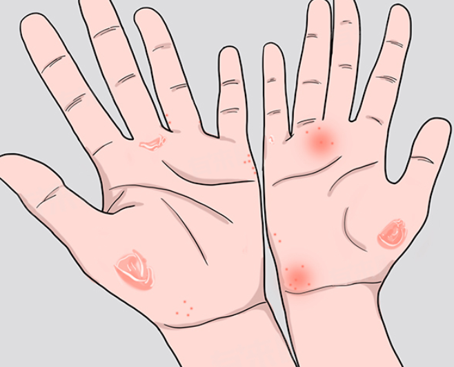 2、汗疱疹:汗疱疹通常与手部汗腺分泌异常有关,常发生于手掌、手指侧面。汗腺导管堵塞,汗液无法正常排出,积聚在皮肤下,就会形成硬疙瘩和水泡,伴有剧烈瘙痒。日常可使用温和的护手霜,保持手部皮肤滋润,改善汗腺代谢。症状发作时,在医生指导下,涂抹含有尿素、水杨酸的药膏,促进水泡干涸、脱皮。瘙痒严重时,可口服抗组胺药物,缓解不适。