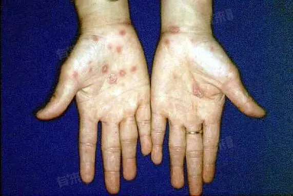 1、皮肤黏膜损伤:初期表现为小片红斑、丘疹,随后可发展为无痛性溃疡,形状多为圆形或椭圆形。溃疡边界清晰,边缘整齐,呈堤状隆起,触之有软骨样硬度,基底光滑、平坦,呈肉红色,表面有少量浆液渗出物。溃疡通常无痛无痒,但在继发感染时可能出现分泌物增多、疼痛等症状。