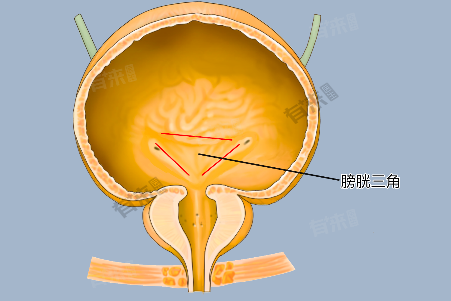 膀胱三角也被称为膀胱三角区,是膀胱底内面的三角形区域,位于两侧输尿管口与尿道内口之间,形状像倒置的三角形。这个三角形的尖部位于膀胱颈,向膀胱颈内延伸,男性止于精阜,女性止于尿道。膀胱三角是膀胱内具有特殊结构和功能的重要区域,由于这一区域在膀胱中的特殊位置,成为了膀胱镜检查时的重点观察对象。