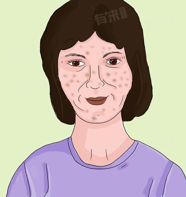- 黄褐斑:主要发生在颊部,两侧对称,也可发生在前额、眼周、口周等部位。严重者可泛发全面部,且多呈蝶形对称分布于两颊部。