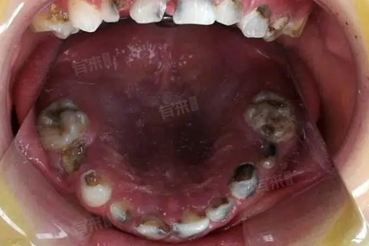 5、四环素牙:是一种特殊的内源性着色疾病,主要发生在牙齿发育期间服用了四环素类药物的个体,四环素类药物会与牙齿组织中的钙离子结合,形成稳定的四环素钙复合物沉积于牙本质内,导致牙齿呈现黄、灰乃至黑色。四环素牙的治疗难度较大,通常需要通过漂白、贴面或冠修复等方法来改善牙齿颜色。