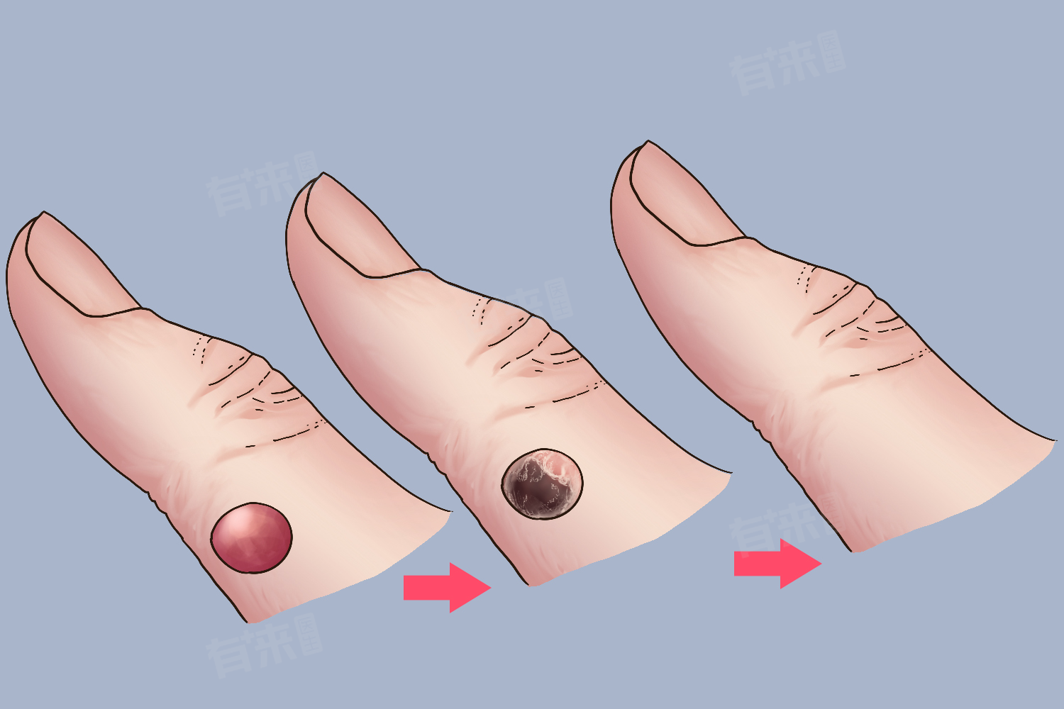 - 在恢复的过程中,水疱或血疱会逐渐自行吸收,导致疱壁逐渐干瘪、自行脱落。但是这个时间范围并不是绝对的,有些人可能在1周左右就能完全消退,而有些人可能需要更长的时间,甚至达到1-2个月。