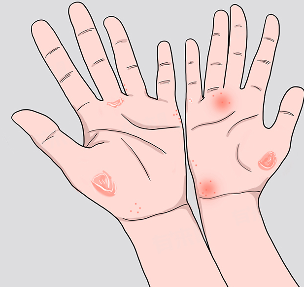 4、手癣:手癣由皮肤癣菌感染引起,是浅表真菌性皮肤病的一种。感染后,手掌部位会出现瘙痒、蜕皮、红肿等症状。治疗时,可外用硝酸咪康唑乳膏等抗真菌药物。