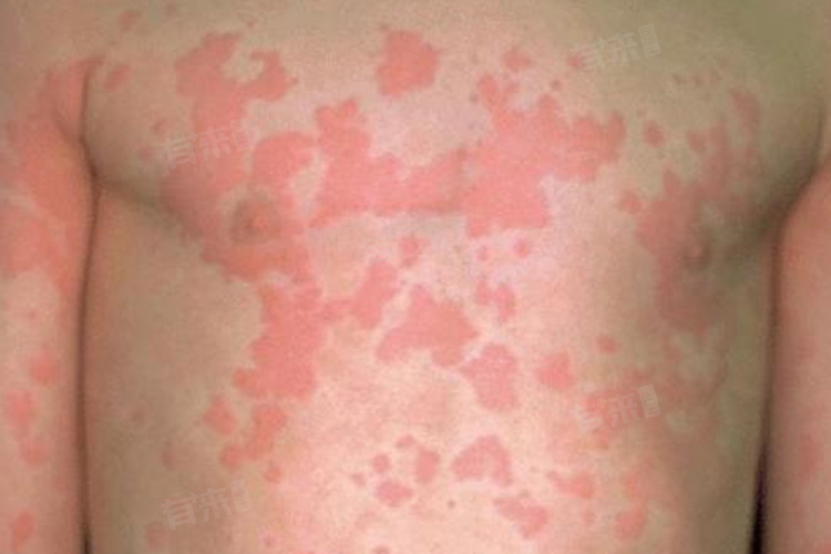 2、症状:荨麻疹风团最显著的症状是皮肤上出现快速起落的红色或苍白色风团,大小不一、形状各异,可孤立存在或融合成片,患者常感到剧烈瘙痒,甚至伴有烧灼感或刺痛感,部分患者在风团出现前可有前驱症状,如发热、头痛、恶心等。