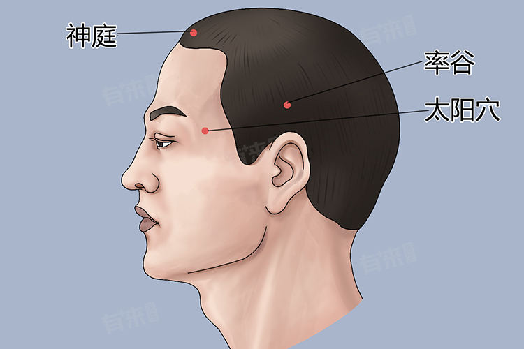 - 位于头部侧面,眉梢和外眼角之间向后一横指的凹陷处。用双手的食指和中指分别按在两侧的太阳穴上,顺时针和逆时针方向各按摩10圈,具有缓解头痛、眼部疲劳的作用。