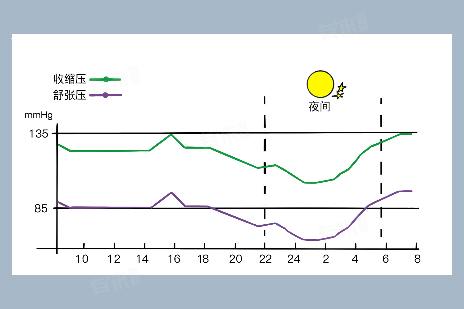 - 昼夜节律:人体的血压存在一定的昼夜节律,通常在夜间较低,白天逐渐升高。不过,具体的波动模式因人而异,有些人可能会在下午或傍晚出现血压峰值。