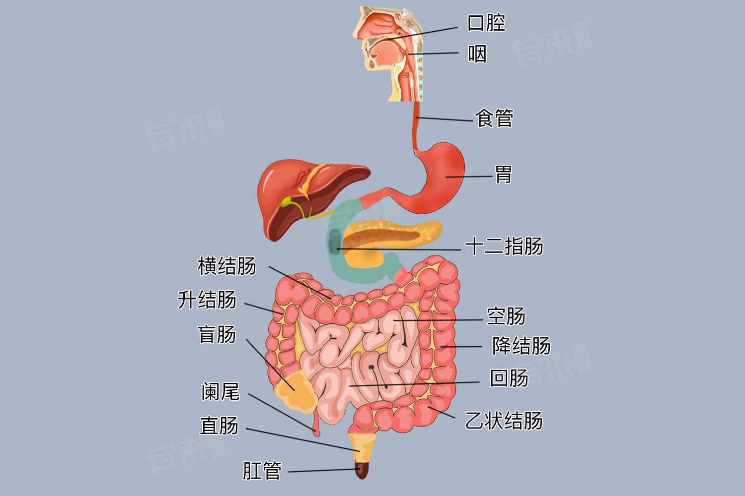 2、咽:咽是一个肌性管道,呈上宽下窄、前后略扁的漏斗形。它是呼吸道和消化道的共同通道,分为鼻咽、口咽和喉咽三部分。鼻咽部与鼻腔相通,口咽部与口腔相通,喉咽部与喉腔相通。当我们吞咽食物时,会厌软骨会关闭喉口,防止食物进入气管,食物则通过咽顺利进入食管。
