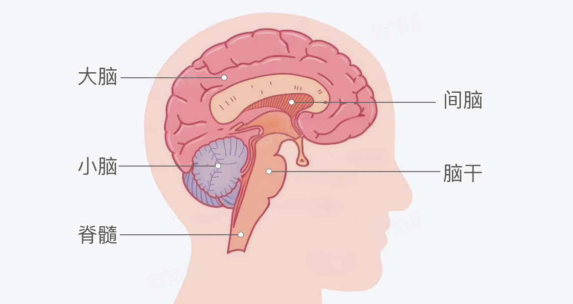 - 其中大脑位于颅腔的前部,是中枢神经系统的最高级部分,包括左右两个大脑半球,主要负责思维、记忆、情感、语言等高级神经活动。间脑位于大脑半球之间,主要包括丘脑和下丘脑,丘脑是感觉传导的重要中继站,而下丘脑则负责调节内脏活动和内分泌活动。小脑位于颅后窝,主要参与躯体平衡、肌肉张力的调节和协调随意运动。脑干则包括中脑、脑桥和延髓,是连接大脑、小脑和脊髓的桥梁,并负责调节呼吸、心跳、消化等重要生理活动。