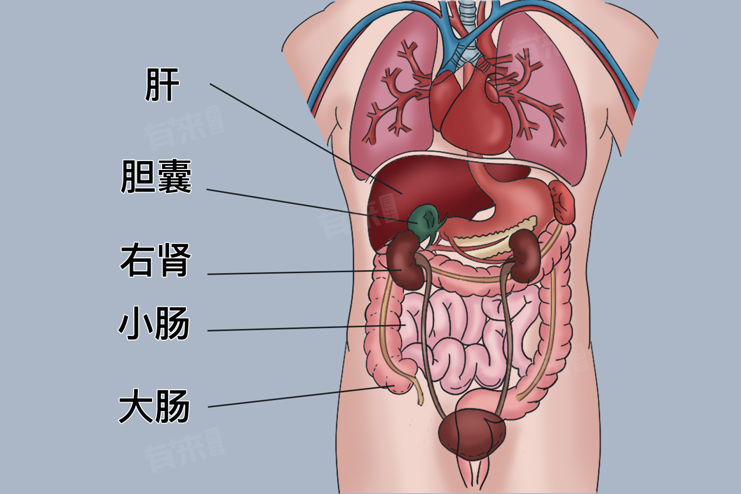 1、肝:肝脏是人体最大的实质性器官,大部分位于右季肋区和上腹区,小部分位于左季肋区。其上面和前面大部分被腹膜覆盖,仅有一小部分裸区直接与膈和腹后壁相连。肝脏在物质代谢、解毒、胆汁生成等方面发挥关键作用,如将血液中的葡萄糖转化为肝糖原储存起来,需要时再分解供能。