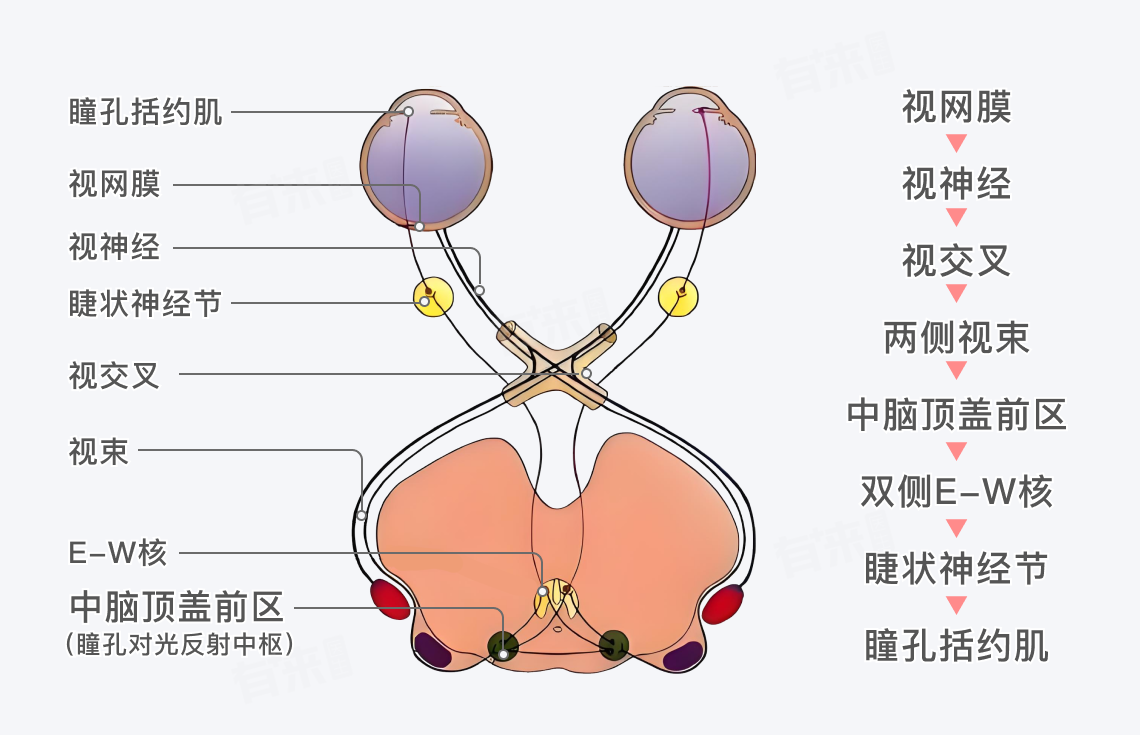 瞳孔对光反射中枢主要位于中脑的顶盖前区以及双侧动眼神经副核,简称E-W核。视网膜作为光感受器,在受到光线刺激后,会产生神经冲动。
