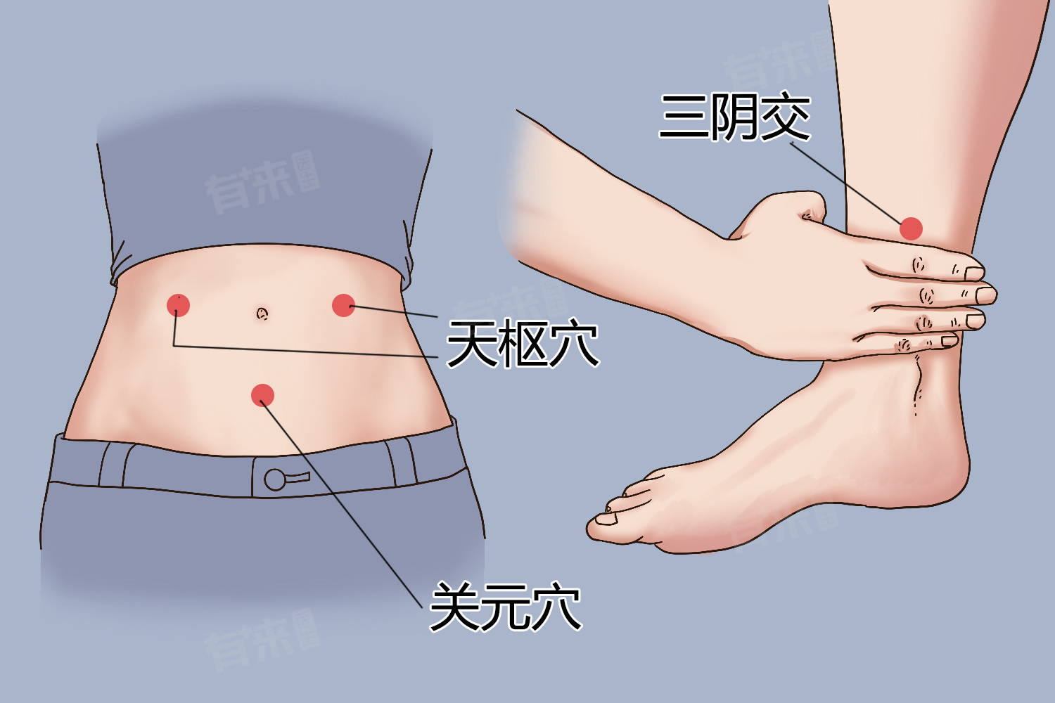 - 位于小腿内侧,内踝尖上三寸处,胫骨内侧缘后际。按摩此穴可以促进卵巢功能正常,对月经疾病有着不错的治疗效果。经常按摩三阴交穴还可以延缓女性衰老,推迟女性更年期。