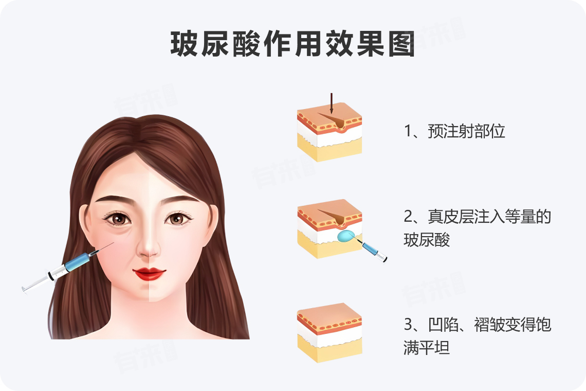 - 玻尿酸是一种天然存在于人体组织中的多糖类物质,具有很强的吸水能力,能够增加皮肤的体积和弹性,常用于填充皱纹、增加唇部丰满度等。它的主要优点在于效果自然,副作用少,且可通过酶解快速调整或恢复,适合初次尝试填充治疗的人群。此外,玻尿酸填充物种类繁多,针对不同部位和效果需求有多种选择,维持时间通常在6个月到1年不等。